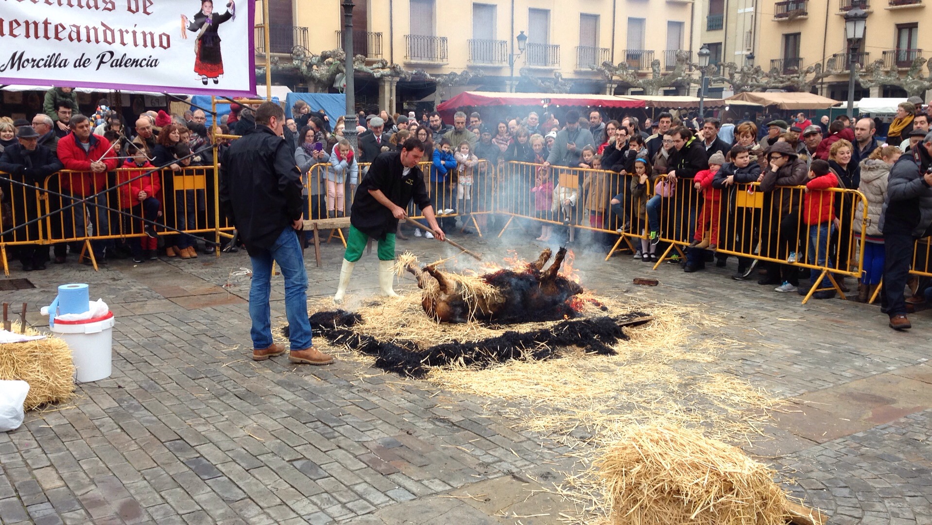 Centenares de palentinos se dan cita en la Plaza Mayor durante esta mañana para revivir el rito de la matanza.